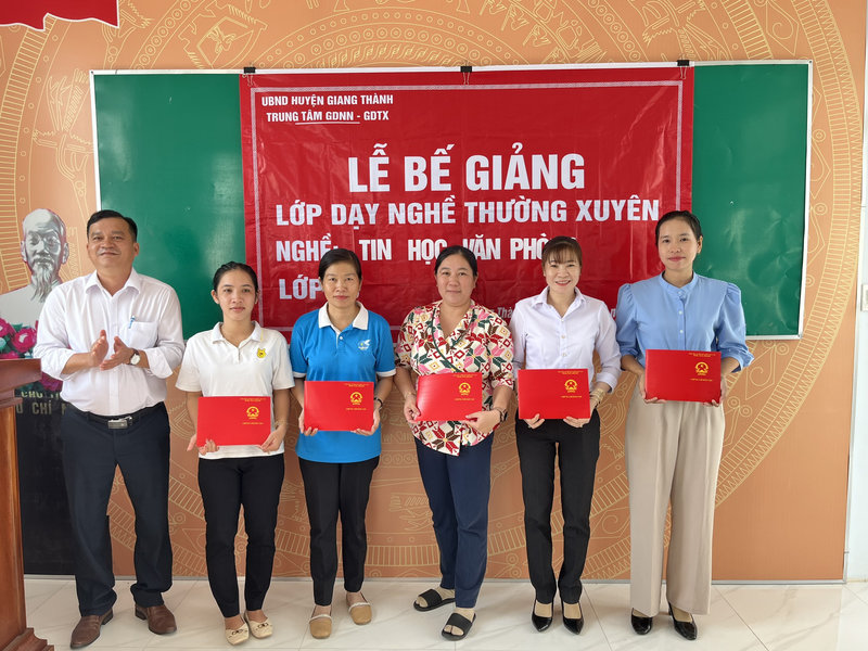 Chiều ngày 05/12, tại Hội trường Ủy ban nhân dân xã Vĩnh Điều, Trung tâm Giáo dục nghề nghiệp - giáo dục thường xuyên huyện Giang Thành phối hợp UBND xã Vĩnh Điều tổ chức Lễ bế giảng lớp nghề tin học văn phòng dành cho ban lãnh đạo ấp, hội viên thanh niên và hội viên phụ nữ.