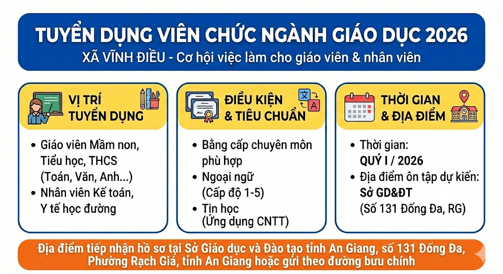 UBND xã thông báo đến toàn thể nhân dân và các ứng viên quan tâm thường xuyên theo dõi thông báo chi tiết về chỉ tiêu cụ thể của từng trường trên địa bàn xã Vĩnh Điều để kịp thời chuẩn bị hồ sơ đăng ký.