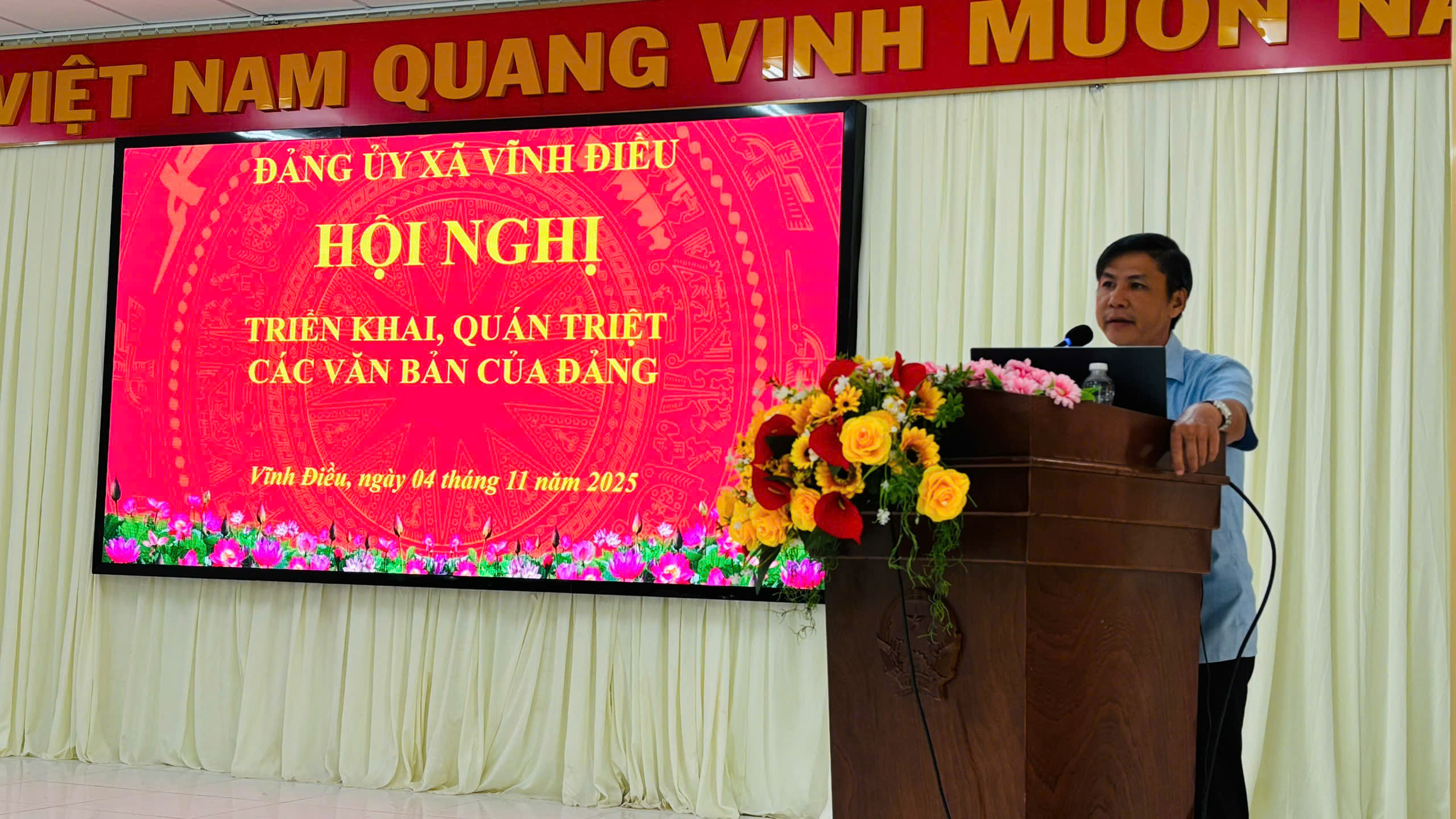 Sáng ngày 04/11/2025, Đảng ủy xã Vĩnh Điều tổ chức Hội nghị triển khai, quán triệt các văn bản của Đảng. Dự Hội nghị có đồng chí Huỳnh Thiện Khoa, Phó Bí thư Thường trực Đảng ủy, Chủ tịch HĐND xã; các đồng chí Ủy viên Ban Thường vụ, Ủy viên Ban Chấp hành Đảng bộ xã; Ủy viên Ủy ban Kiểm tra Đảng ủy và các đồng chí Ủy viên Ban Chấp hành các đảng bộ, chi bộ cơ sở, chi bộ trực thuộc.