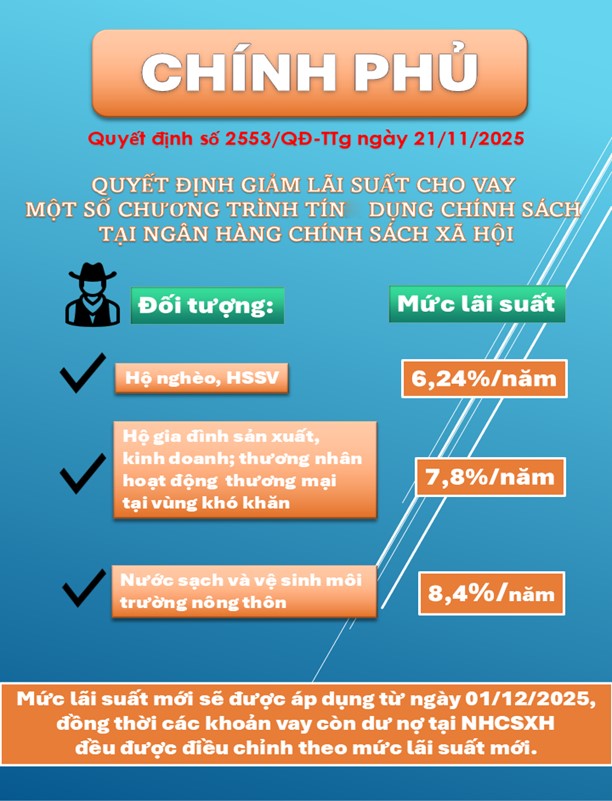 Ngày 21/11/2025, Phó Thủ tướng Chính phủ Hồ Đức Phớc vừa ký Quyết định số 2553/QĐ-TTg về việc điều chỉnh giảm lãi suất cho vay một số chương trình tín dụng chính sách tại Ngân hàng Chính sách xã hội (NHCSXH).