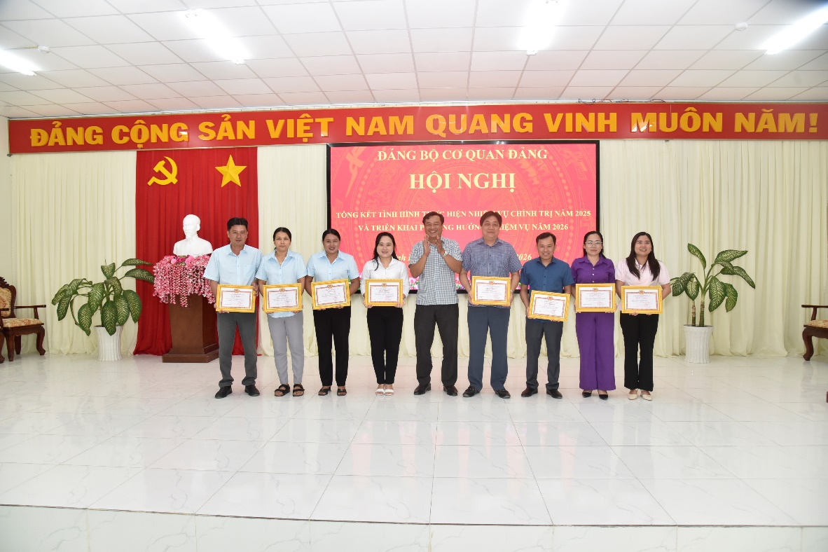 Đồng thời, Đảng bộ cơ quan Đảng đề ra Nghi quyết phương hướng nhiệm vụ năm 2026 với 06 chỉ tiêu cụ thể: (1) Phấn đấu 100% cán bộ, đảng viên, công chức tham gia học tập, tiếp thu các chỉ thị, nghị quyết của Đảng, chính sách, pháp luật của Nhà nước. (2) Tỷ lệ đảng viên tham gia sinh hoạt chi bộ đạt từ 95% trở lên. (3) Phấn đấu kết nạp 01 đảng viên. 2 (4) Có từ 90% trở lên đảng viên, công chức hoàn thành tốt nhiệm vụ, trong đó có 20% đảng viên hoàn thành xuất sắc nhiệm vụ. (5) Có 100% cán bộ, đảng viên, công chức hiểu biết về chuyển đổi số, kiến thức và kỹ năng số, sử dụng tốt các nền tảng, dịch vụ số phục vụ công việc. (6) Mỗi cơ quan, đơn vị có ít nhất một mô hình “Dân vận khéo”.