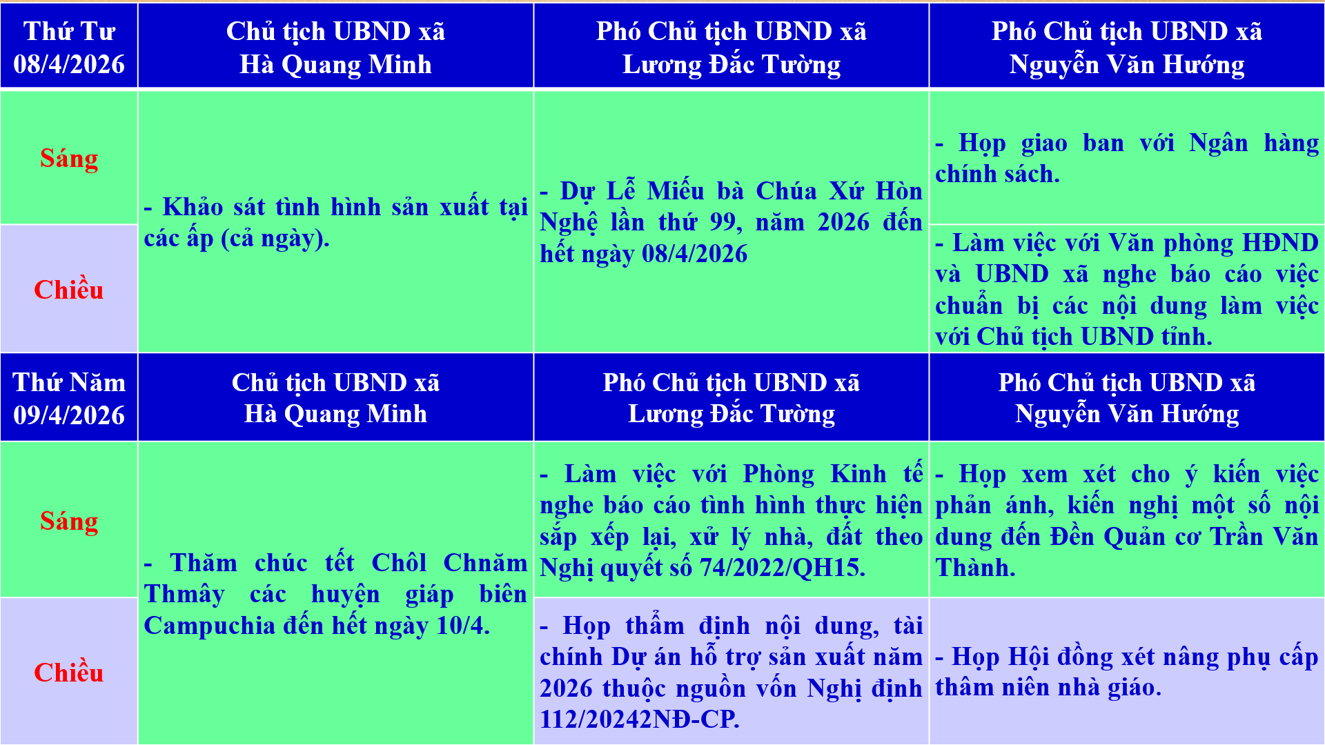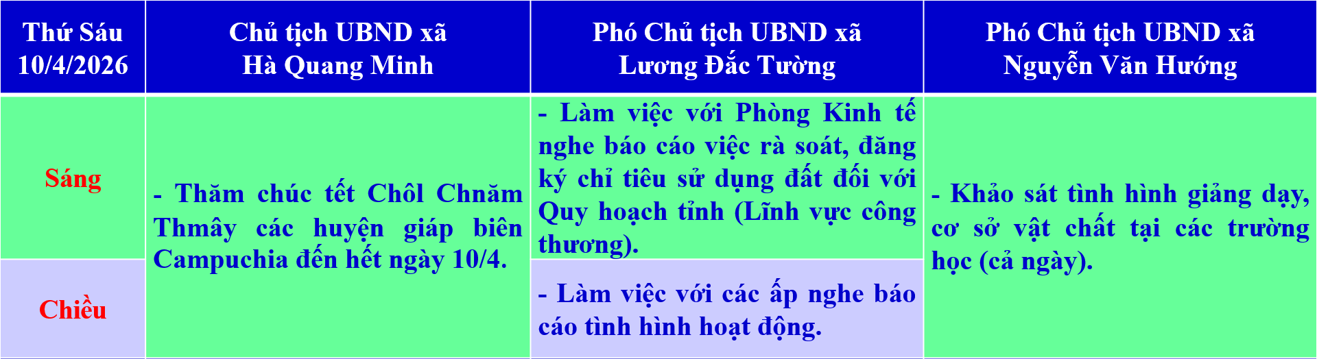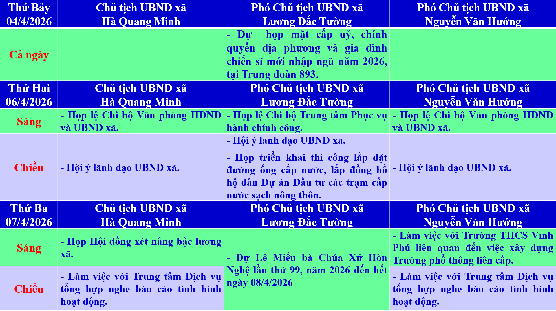 aA Lịch làm việc Lịch Công tác của Lãnh đạo UBND xã Vĩnh Điều từ ngày 04/4/2026 đến ngày 10/4/2026 06/04/2026, 21:49 Thanh Tú Quay về Chia sẻ Z Copy link thành công Tin khác Lịch Công tác của Lãnh đạo UBND xã Vĩnh Điều từ ngày 09/3/2026 đến ngày 15/3/2026 Lịch làm việc 08/03/2026 Lịch làm việc cuối tháng 10/2018 của Thường trực UBND tỉnh Lịch làm việc 15/10/2018 Lịch làm việc đầu tháng 10/2018 của Thường trực UBND tỉnh Lịch làm việc 02/10/2018 /lich-cong-tac-cua-lanh-dao-ubnd-xa-vinh-dieu-tu-ngay-0442026-den-ngay-1042026