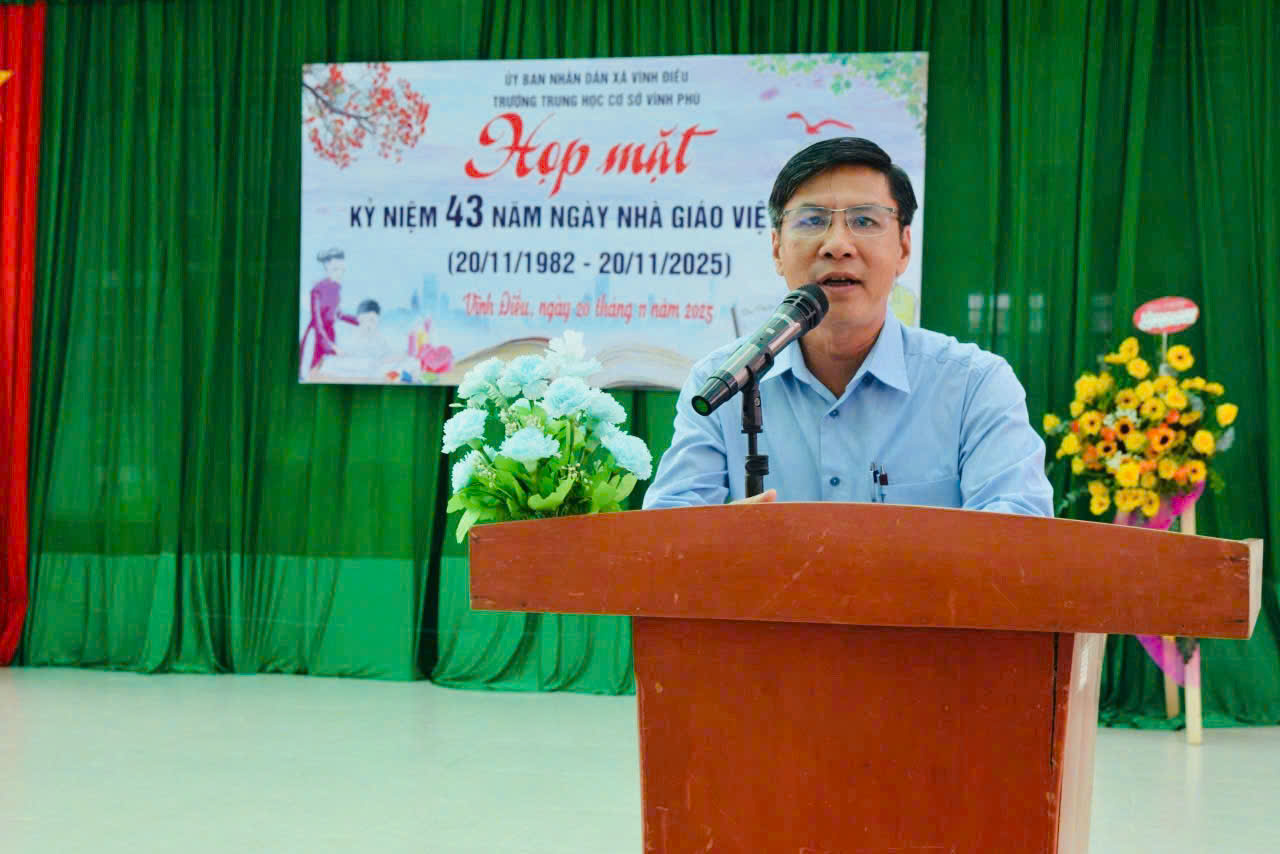 Phát biểu tại buổi lễ, Phó Bí thư Thường trực Đảng ủy, Chủ tịch HĐND xã Huỳnh Thiện Khoa bày tỏ niềm xúc động, vui mừng khi về dự Lễ kỷ niệm tại nhà trường. Đồng chí khẳng định truyền thống "Tôn sư trọng đạo" luôn được Đảng bộ và nhân dân xã nhà gìn giữ và phát huy. Đồng chí cũng ghi nhận những nỗ lực vượt khó, đổi mới phương pháp dạy học, nâng cao chất lượng giáo dục của đội ngũ cán bộ, giáo viên trong thời gian qua. Và nhấn mạnh: Giáo dục luôn là ưu tiên hàng đầu trong chiến lược phát triển của địa phương. Đảng ủy, chính quyền xã sẽ tiếp tục quan tâm đầu tư cơ sở vật chất, tạo điều kiện tốt nhất để thầy và trò nhà trường yên tâm công tác, phấn đấu đạt được nhiều thành tích cao hơn nữa.