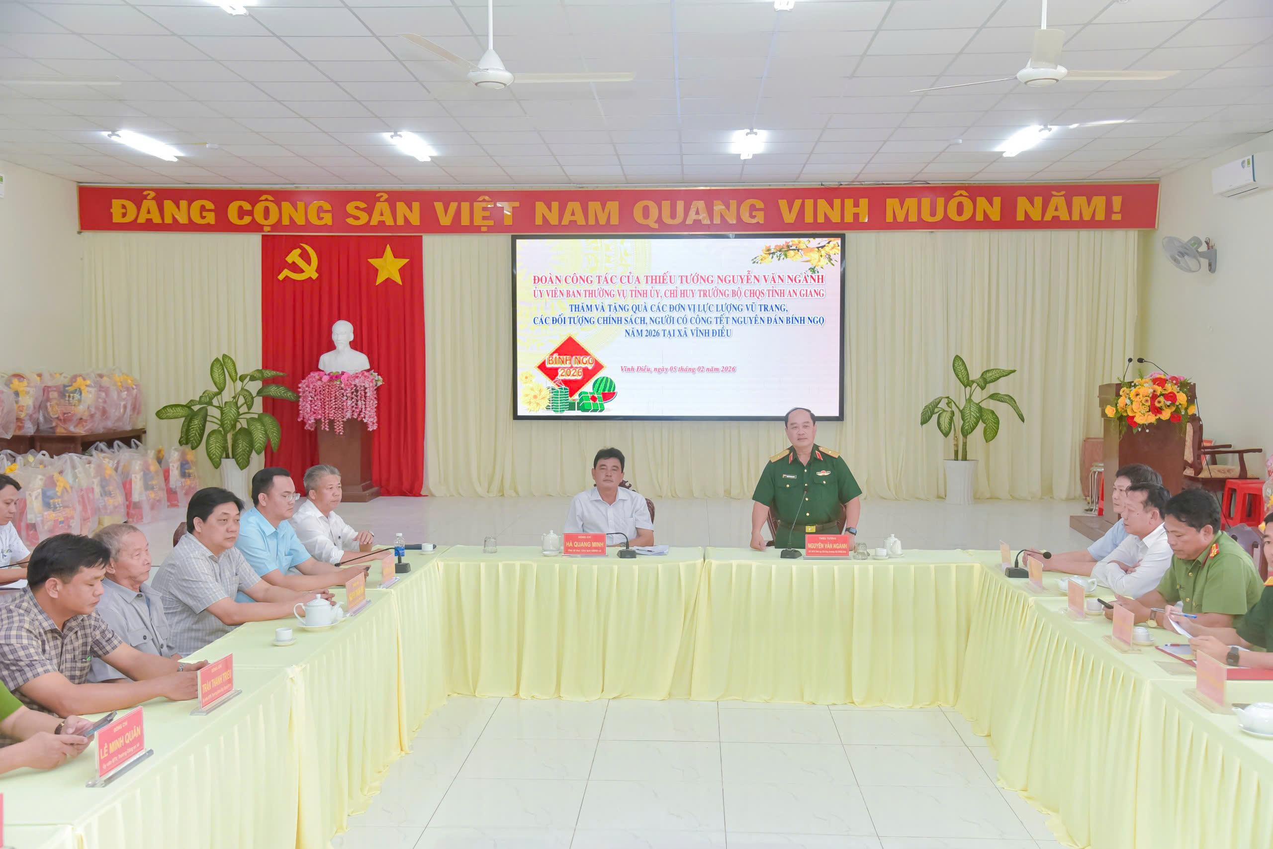 Sáng 05/02/2026, Đoàn công tác của tỉnh An Giang do Thiếu tướng Nguyễn Văn Ngành, Ủy viên Ban Thường vụ Tỉnh ủy, Chỉ huy trưởng Bộ Chỉ huy Quân sự tỉnh làm trưởng đoàn đến thăm, tặng quà các đơn vị lực lượng vũ trang và các đối tượng chính sách, người có công tại xã Vĩnh Điều, nhân dịp Tết Nguyên đán Bính Ngọ năm 2026.