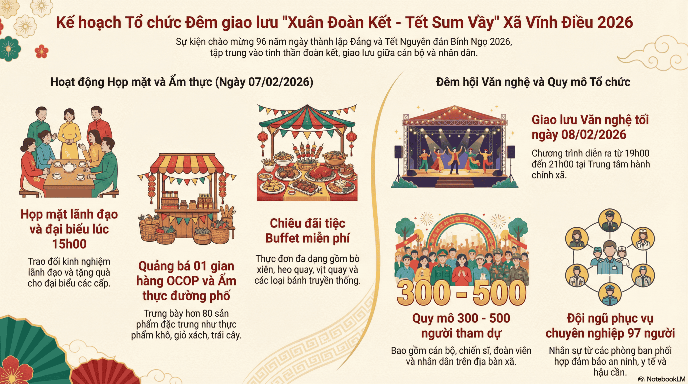19h00 - 21h00 (08/02/2026) | Giao lưu Văn nghệ | - Chương trình văn nghệ với chủ đề "Mừng Đảng, Mừng Xuân" . - Địa điểm: Tại Trung tâm hành chính xã Vĩnh Điều. |