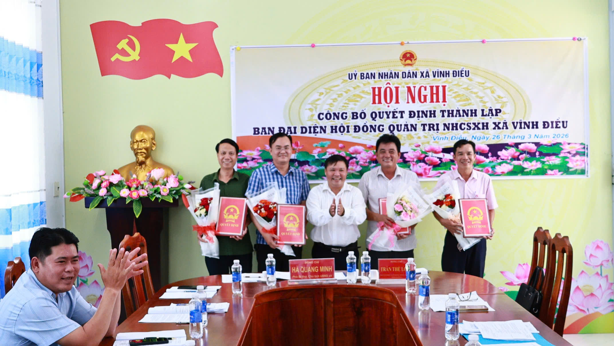 Ngày 26/3/2026, UBND xã Vĩnh Điều tổ chức Hội nghị công bố Quyết định thành lập và phiên họp thứ nhất Ban đại diện Hội đồng quản trị Ngân hàng Chính sách xã hội (NHCSXH) xã. Hội nghị do ông Hà Quang Minh – Chủ tịch UBND xã, Trưởng Ban đại diện HĐQT NHCSXH xã chủ trì. Tham dự có ông Trần Thế Loan – Phó Giám đốc NHCSXH tỉnh cùng đại diện các phòng, ban, ngành, Mặt trận Tổ quốc và các đoàn thể chính trị - xã hội trên địa bàn.