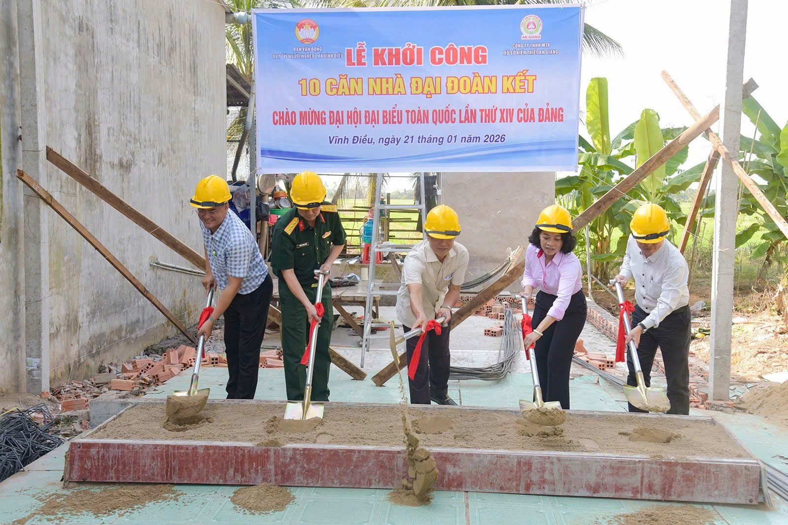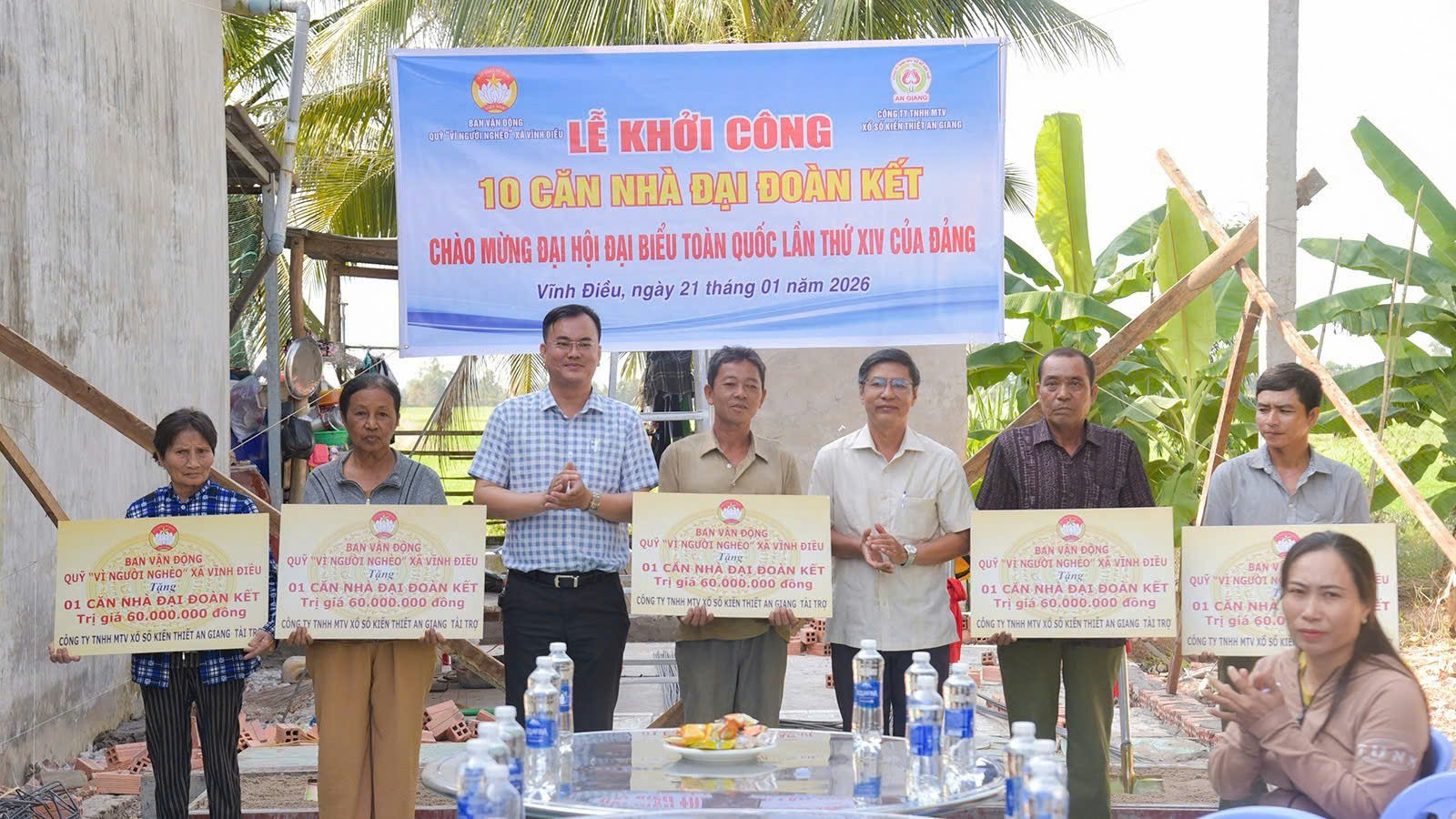 Sáng ngày 21/01/2026, Ban Thường trực Ủy ban MTTQ Việt Nam xã Vĩnh Điều phối hợp Ban Vận động Quỹ “Vì người nghèo” xã và các đơn vị tài trợ tổ chức Lễ khởi công xây dựng 10 căn nhà “Đại đoàn kết” cho hộ nghèo, hộ cận nghèo trên địa bàn xã, từ nguồn hỗ trợ của Công ty TNHH MTV Xổ số Kiến thiết An Giang.