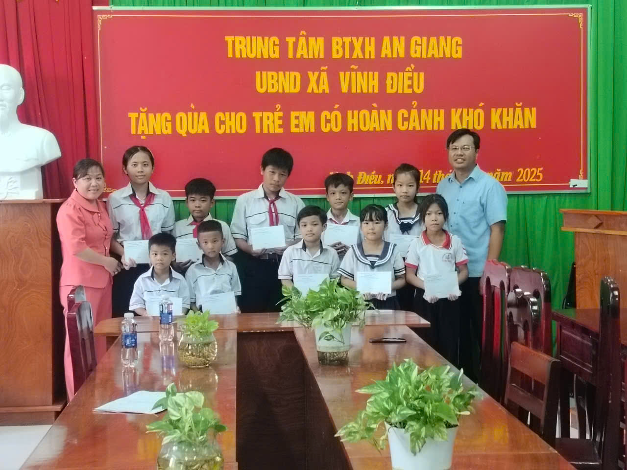 Vĩnh Điều (An Giang) – Nhân dịp khai giảng năm học 2025-2026, Trung tâm Bảo trợ Xã hội tỉnh An Giang phối hợp cùng UBND xã Vĩnh Điều vừa tổ chức buổi trao quà ý nghĩa cho các em học sinh có hoàn cảnh khó khăn trên địa bàn xã.