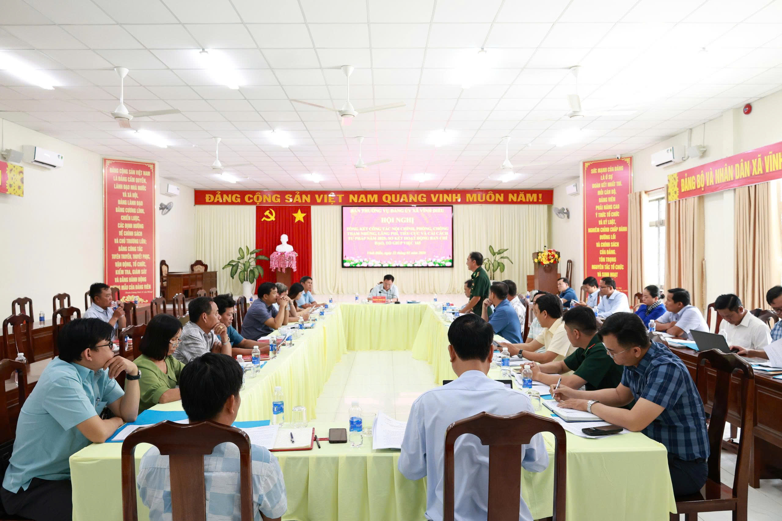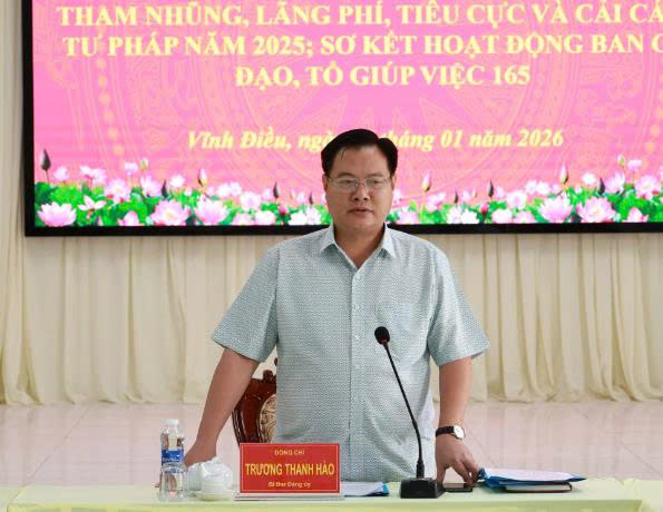 Sáng ngày 22/01/2026, Đảng ủy xã Vĩnh Điều tổ chức Hội nghị tổng kết công tác nội chính, phòng chống tham nhũng, lãng phí, tiêu cực và cải cách tư pháp năm 2025; đồng thời sơ kết hoạt động của Ban Chỉ đạo 165 và Tổ giúp việc. Hội nghị do đồng chí Trương Thanh Hào – Bí thư Đảng ủy xã chủ trì. Tham dự có các đồng chí thành viên Ban Chỉ đạo 165; lãnh đạo các ban, ngành, Mặt trận, đoàn thể xã và Ban lãnh đạo các ấp.