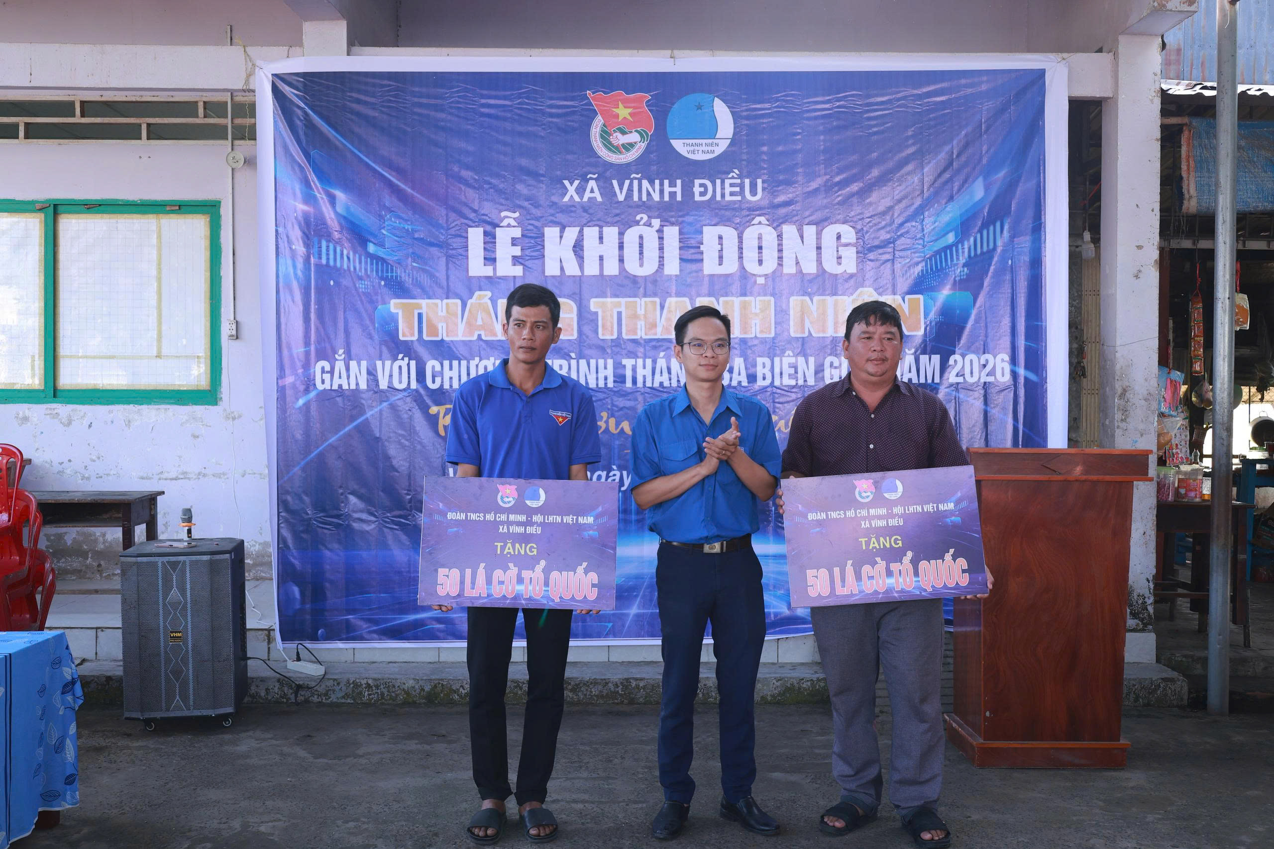 Trong khuôn khổ chương trình, Ban Tổ chức đã trao tặng 20 phần quà cho các hộ nghèo và học sinh có hoàn cảnh khó khăn trên địa bàn xã, thể hiện tinh thần sẻ chia, trách nhiệm của tổ chức Đoàn đối với cộng đồng. Chi đoàn cơ sở Đồn Biên phòng Vĩnh Điều trao tặng mô hình Vườn ươm thanh niên, xã Đoàn trao tặng 100 lá cờ cho 02 ấp Tà Êm và Đồng Cừ, tổng kinh phí 10 triệu đồng.