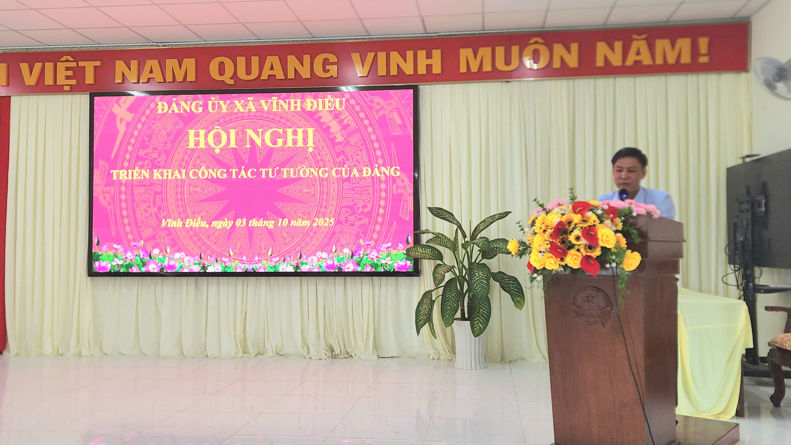 Chiều ngày 03/10/2025, Đảng ủy xã Vĩnh Điều tổ chức Hội nghị Triển khai công tác tư tưởng của Đảng. Đồng chí Huỳnh Thiện Khoa, Phó Bí thư Thường trực Đảng ủy, Chủ tịch HĐND xã dự và chủ trì hội nghị.