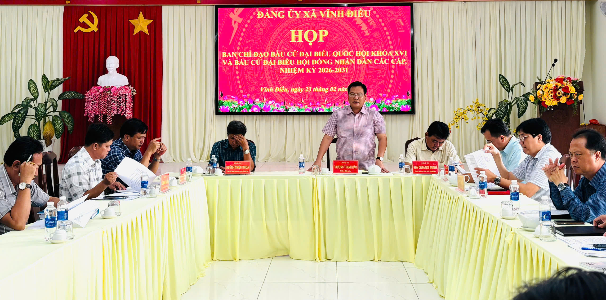 Sáng 23/02/2026, Ban Chỉ đạo công tác bầu cử xã Vĩnh Điều tổ chức họp công bố danh sách chính thức những người ứng cử đại biểu Hội đồng nhân dân xã Vĩnh Điều khóa XIII, nhiệm kỳ 2026-2031 theo từng đơn vị bầu cử. Đồng chí Trương Thanh Hào, Bí thư Đảng ủy xã, Trưởng Ban Chỉ đạo công tác bầu cử xã chủ trì cuộc họp.