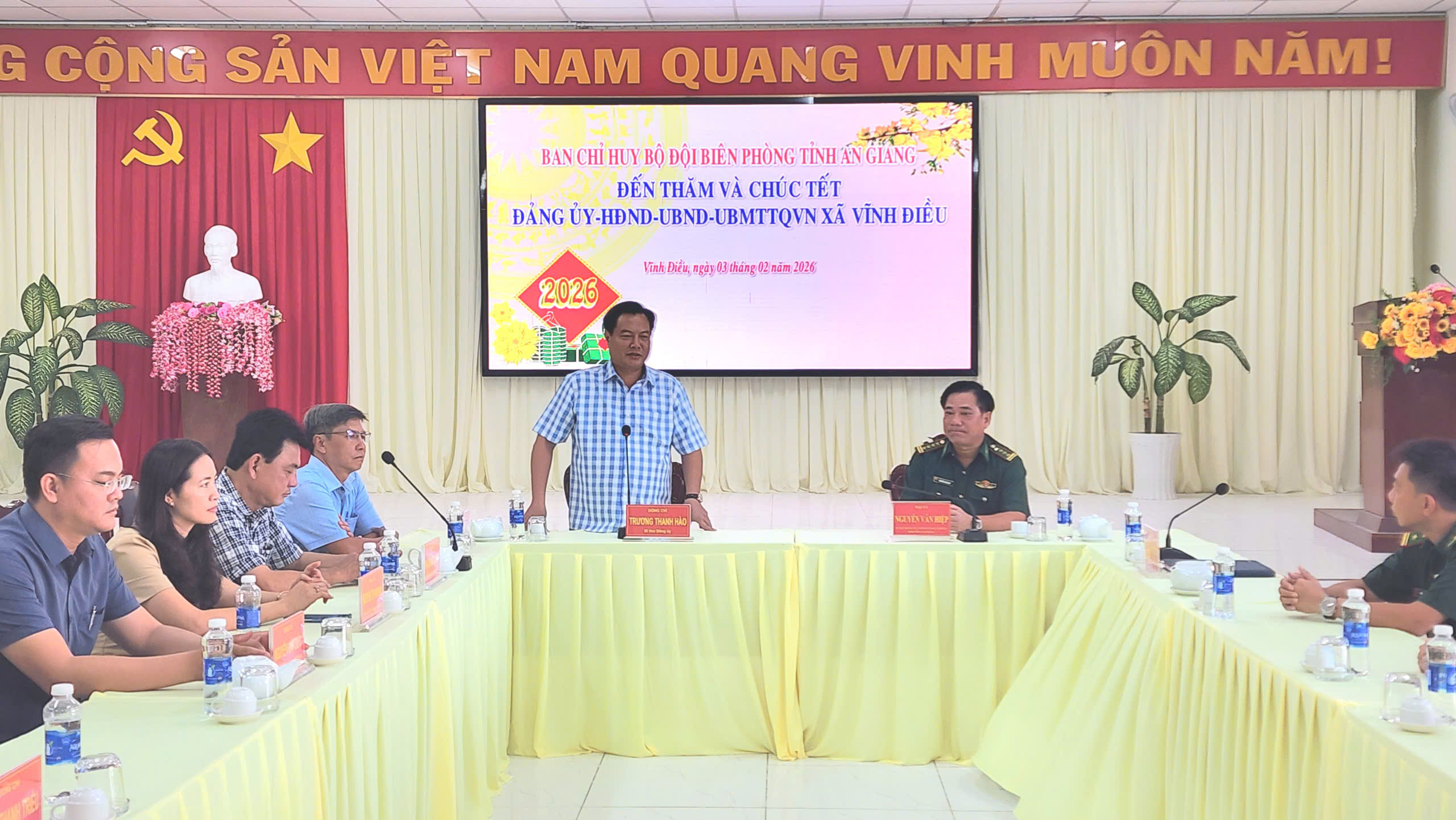 Ngày 03/02/2026, Đoàn công tác của Đảng ủy Ban Chỉ huy Bộ đội Biên phòng tỉnh An Giang do Đại tá Nguyễn Văn Hiệp – Phó Chính ủy Bộ Chỉ huy Quân sự tỉnh, Chính ủy Ban Chỉ huy Bộ đội Biên phòng tỉnh An Giang làm Trưởng đoàn đã đến thăm, chúc Tết Đảng ủy – HĐND – UBND – Ủy ban MTTQ Việt Nam xã Vĩnh Điều nhân dịp Tết Nguyên đán Bính Ngọ năm 2026.