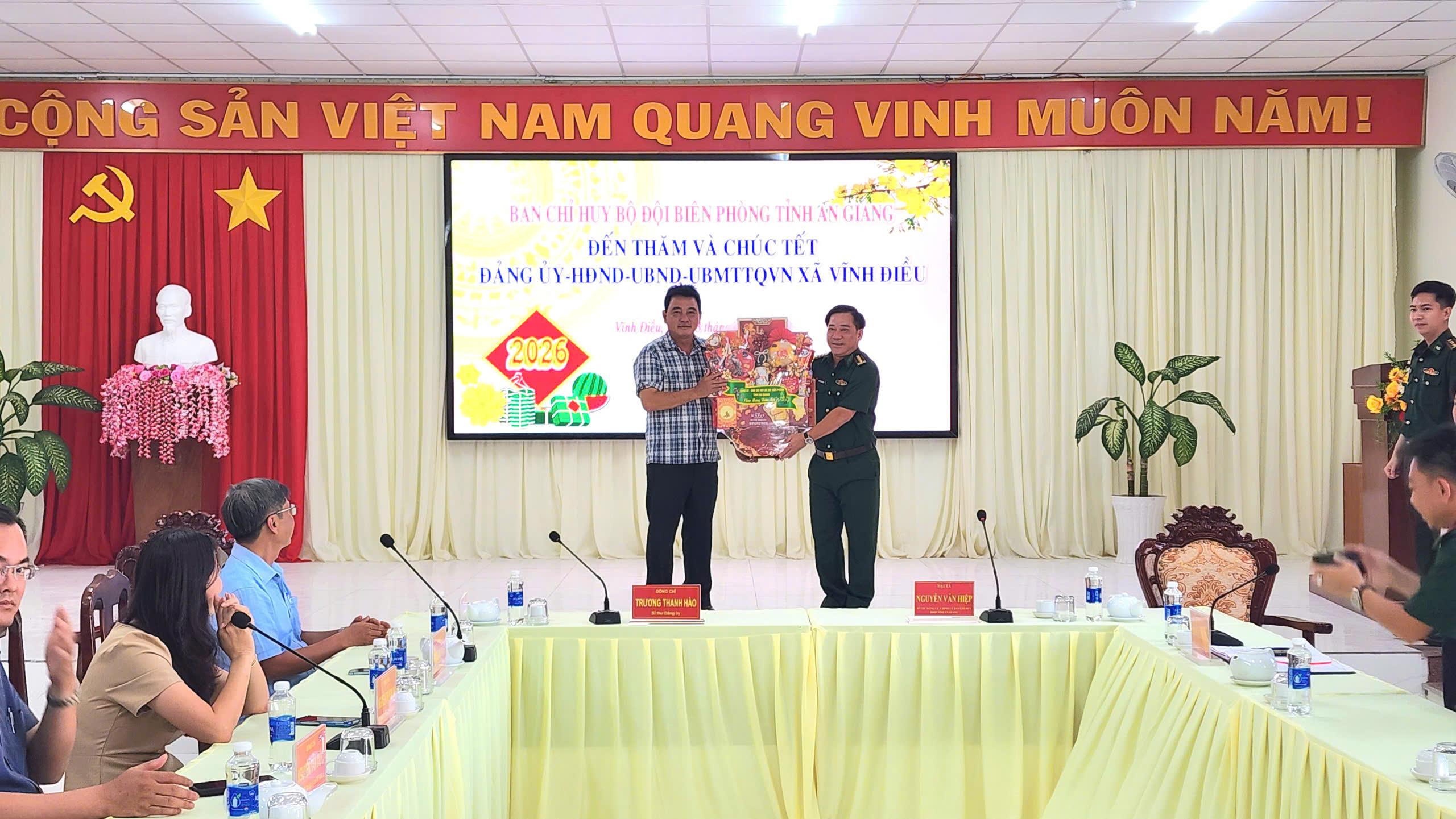 Dịp này, Đoàn công tác Ban Chỉ huy Bộ đội Biên phòng tỉnh An Giang đã trao quà chúc Tết đến Đảng ủy – HĐND – UBND – Ủy ban MTTQ Việt Nam xã Vĩnh Điều, thể hiện sự quan tâm, gắn bó giữa lực lượng Bộ đội Biên phòng với cấp ủy, chính quyền và Nhân dân địa phương.
