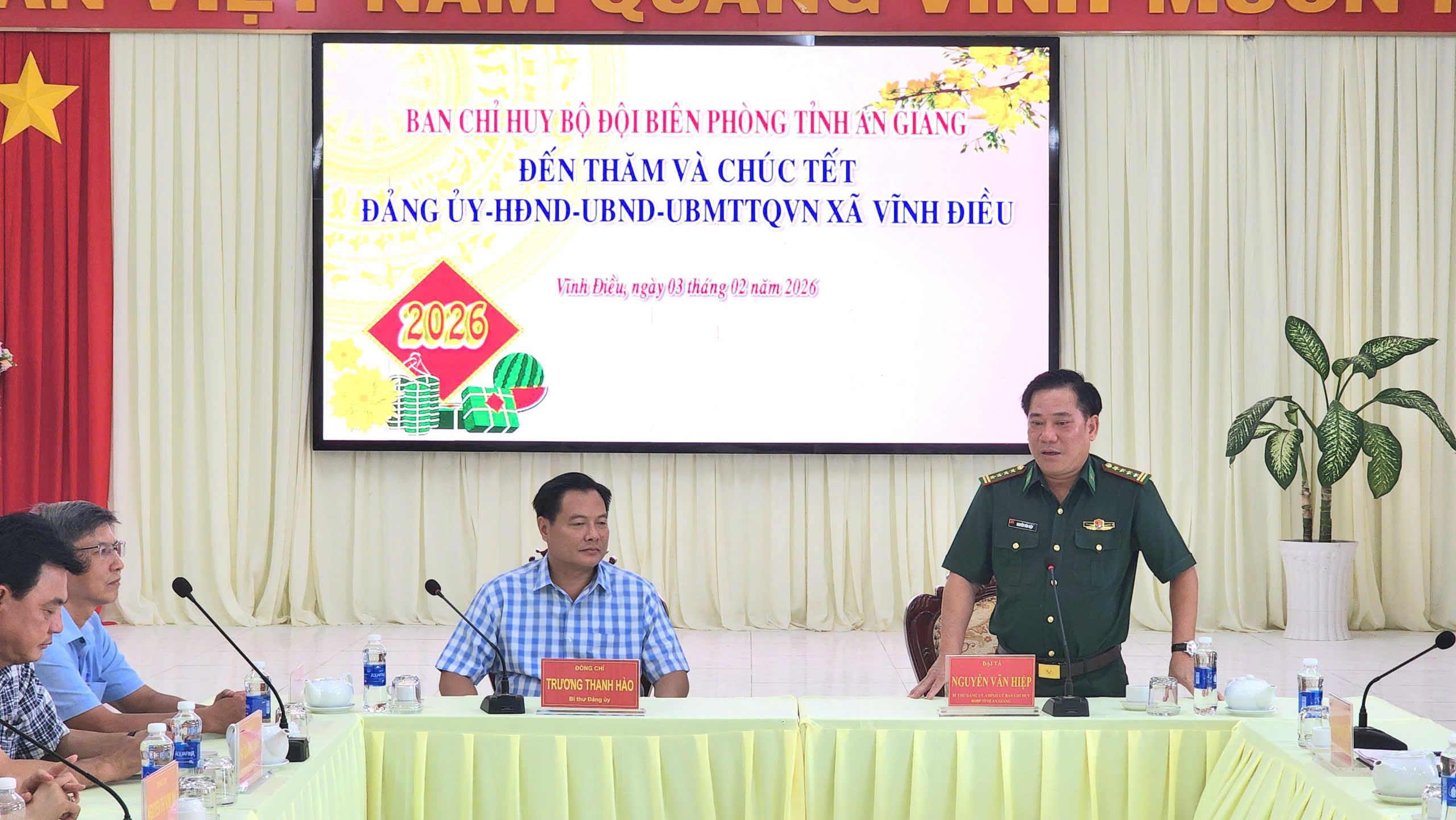 Phát biểu tại buổi gặp gỡ, Đại tá Nguyễn Văn Hiệp ghi nhận và đánh giá cao những kết quả mà Đảng bộ, chính quyền và Nhân dân xã Vĩnh Điều đã đạt được trong thời gian qua; đồng thời biểu dương tinh thần đoàn kết, chủ động phối hợp với lực lượng vũ trang trong xây dựng thế trận quốc phòng toàn dân gắn với thế trận an ninh nhân dân vững chắc. Nhân dịp năm mới, đoàn công tác gửi lời chúc mừng năm mới đến tập thể lãnh đạo, cán bộ, công chức và Nhân dân xã Vĩnh Điều; mong muốn địa phương tiếp tục phát huy truyền thống, giữ vững ổn định địa bàn, góp phần xây dựng khu vực biên giới ngày càng phát triển, bình yên.